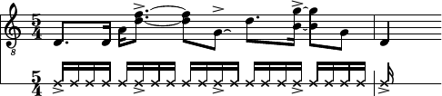 Je me mis donc au travail, en commençant par le chiffre 5 : quenoum d’ordre 5, en cinq strophes, avec cinq mots-rimes... La chanson serait donc composée de cinq carrures de cinq mesures à cinq temps. Ce qui n’est pas sans impliquer un certain degré de dissonance par rapport à ce que l’on attend en général du rock : formaté par carrures de quatre mesures à quatre temps. J’essayai donc de rédiger un riff de guitare en partant de celui d’Arnaud, mais sur une mesure à cinq temps, et qui donne en plus des accents toutes les cinq double-croches.