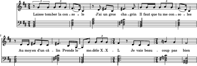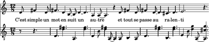 Le rythme du chant suit scrupuleusement la versification, découpée en tétrasyllabes, avec des rythmes plus variés qu’il n’y paraît. Les couplets sont entièrement sur quatre notes re fad / do mi, avec toutes sortes de permutations ; les refrains sont construits sur deux éléments mélodiques (un accord en arpège brisé, et un mouvement conjoint) qui peuvent être permutés et renversés, avec une certaine, hum, qualité expressive (j’entends par là une voix de chanteur de blues, voire un tantinet dégoulinante façon Michel Jonasz — mais ça, j’y reviendrai plus bas).