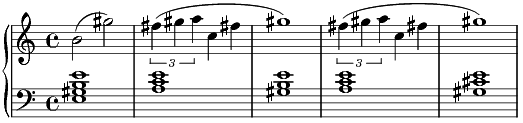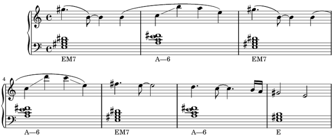 J’ai indiqué par des traits obliques les intervalles larges, qui sont une caractéristique de l’écriture des violons dans le cinéma américain depuis les années 40 (vous en trouverez des exemples dans toutes les "scènes du baiser"). Mais il y a mieux : regardez aussi l’enchaînement de ces deux accords (ce que j’appelle un "balancement"), mi majeur (enrichi) et la mineur (enrichi aussi).