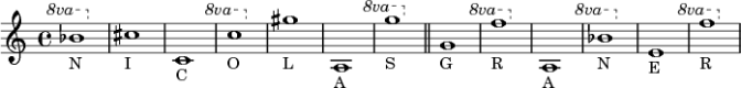 Tout mot se présente donc comme une échelle chromatique non-octaviante, suivant un procédé que j’ai déjà utilisé ici ou . En pratique, cela donne un peu toujours la même chose : il suffit que le mot contienne un E ou un A pour que notre motif soit ancré par un mi ou un la grave, plus quelques échappées vaguement dépolarisantes dans l’aigu. Et dans le cas de notre ami Nicolas Graner, ça ne loupe pas :